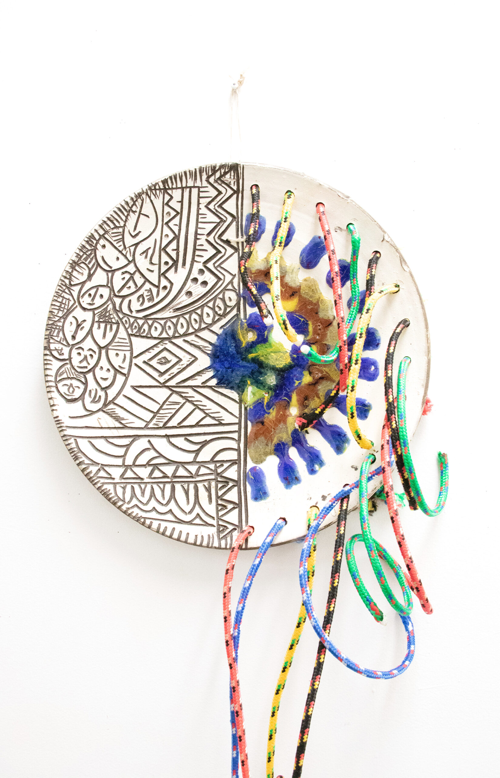 Charcoal clay, Oxides, fabrics, Krobo trade beads and bungee cables